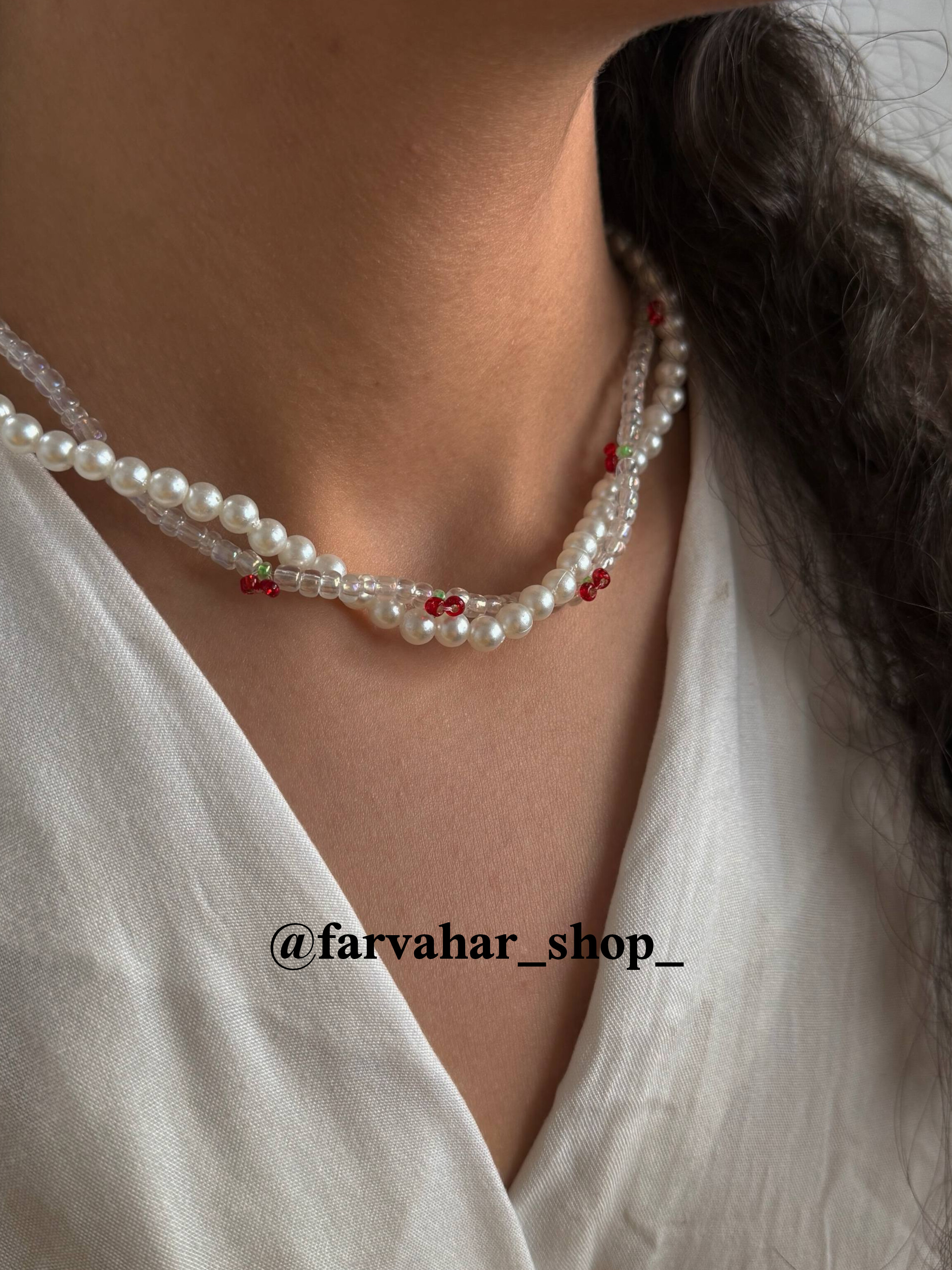 گردنبند یلدایی دولاین گیلاس و مروارید 🍒 🦪قفل آبکاری شده ✨