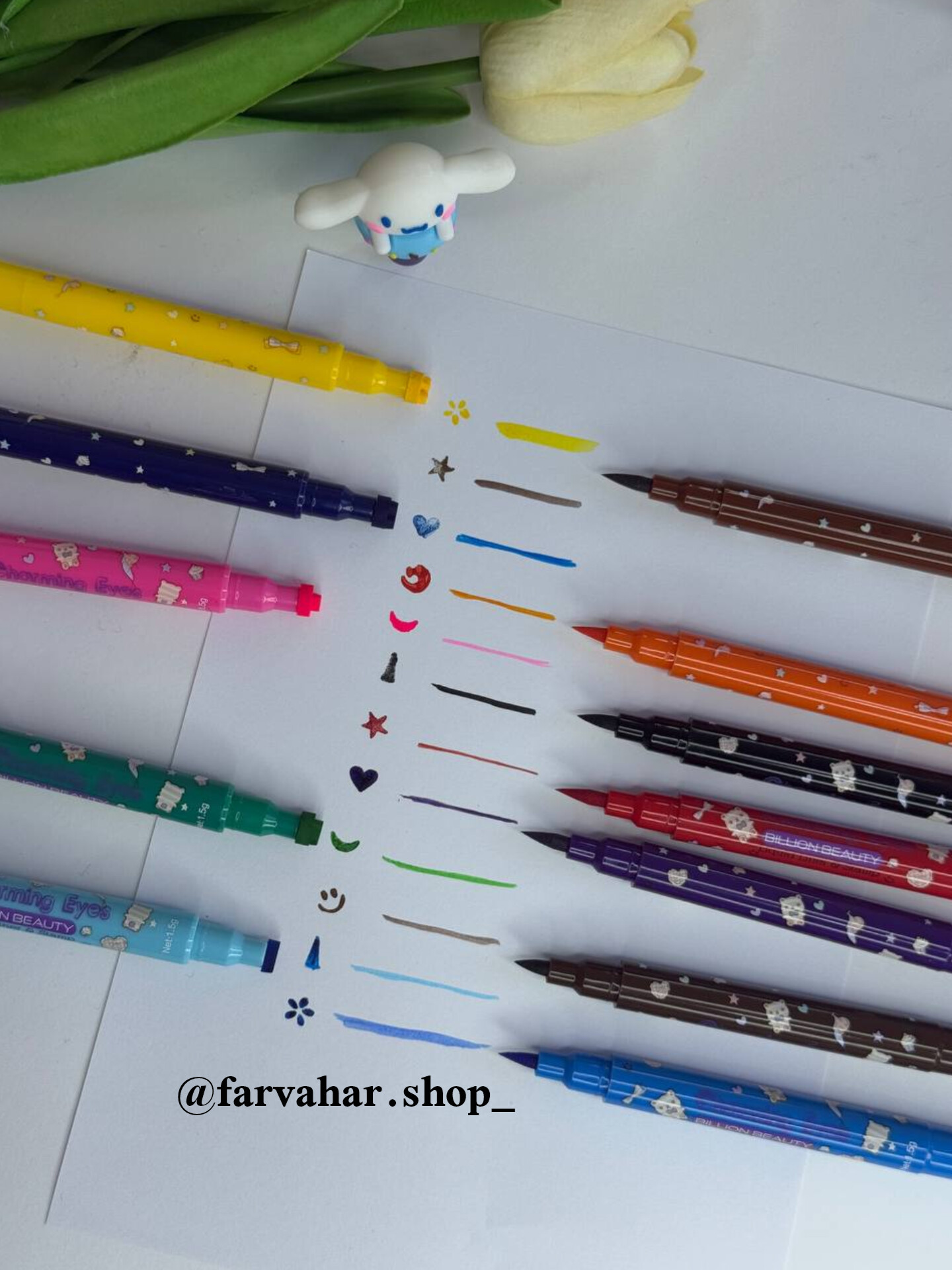 رنگبندی : 12 عدد (سبز،بنفش،سرمه ای،قهوه ای تیره،قهوه ای روشن،مشکی،زرد،آبی آسمونی،آبی پررنگ،صورتی،نارنجی،قرمز). فاقد تست حیوانی. وزن هرکدام 15g. سری ماژیکی. هر رنگ سری استامپی متفاوتی دارد (سبز☽ ، بنفش♥ ، سرمه ای♥، قهوه ای تیره(: ، قهوه ای روشن ، مشکی∇ ، زرد✽ ، آبی کم رنگ∇ ، آبی پررنگ✽ ، صورتی☽ ، نارنجی(: ، قرمز★). بدون تغییر حالت. قابلیت خشک شدن سریع. استفاده راحت. بدون ریزش. ضدآب. طراحی فانتزی. مناسب داشتن میکاپ خاص و فانتزی