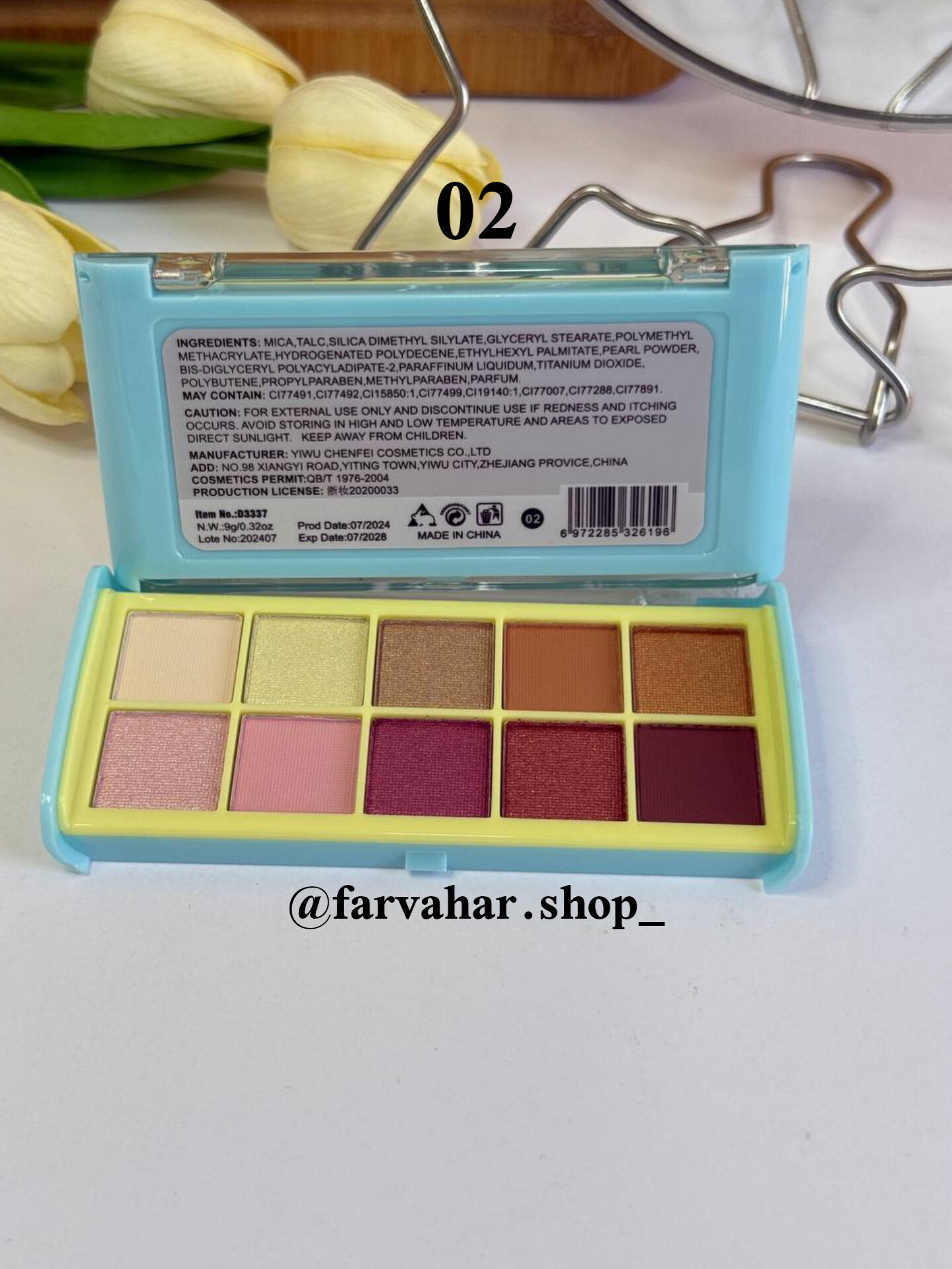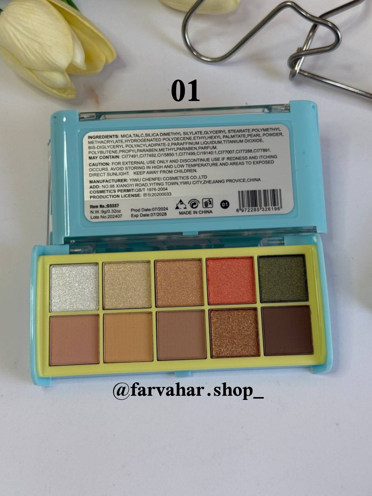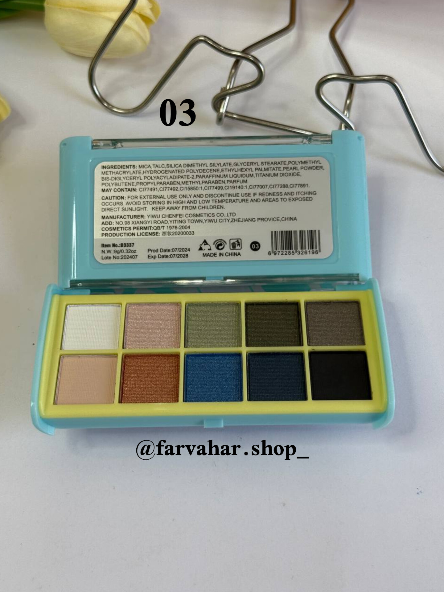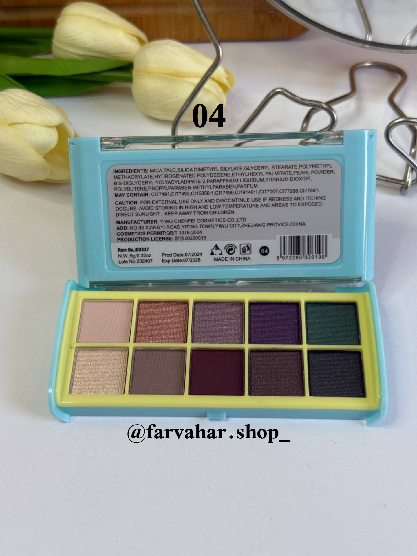 پالت سایه چشم 10 رنگ دودو گرل DODO GIRL. 👁️فاقد تست حیوانی ( CRUELTY FREE ). ساخت چین 🇨🇳. حجم : هر پالت 9 g. رنگ بندی شماره 01 _ 02 _ 03 _ 04. هر پالت 10 رنگ مات و شاین دار. دارای بافت نرم و ابریشمی. پوشش یکدست و کامل. دارای کیفیت عالی. ضد حساسیت. مناسب برای انواع پوست. فاقد پارابن